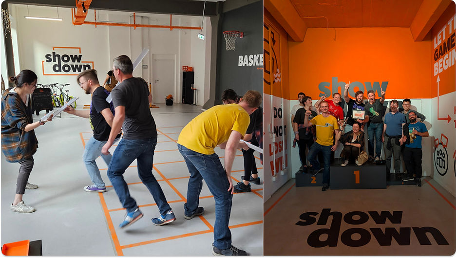 Ya que estábamos todos en el mismo lugar, decidimos tomarnos un tiempo para divertirnos. Una tarde fuimos a Showdown, nos dividimos en tres equipos y jugamos una serie de retos físicos y cómicos. Descubrimos quién tiene mejor equilibrio, que todos somos terribles reconociendo banderas y canciones de series, y que el Equipo Sqwerty es el campeón indiscutible.