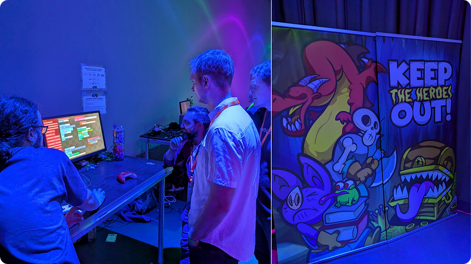 Una sorpresa especial fue descubrir que, a dos mesas de distancia, un desarrollador indie presentaba Keep the Heroes Out, un juego digital basado en su juego de mesa físico, y había integrado nuestro plugin de Block Coding dentro del propio juego para crear escenarios. ¡Fue increíble verlo! Aunque nunca pensamos que el plugin se usaría así, varios desarrolladores mencionaron usos similares —y el hecho de que sea de código abierto les permite hacerlo libremente.